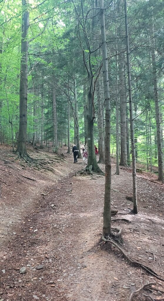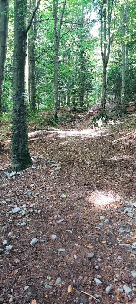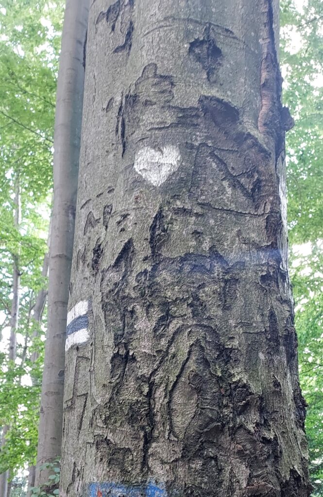Po wejściu do lasu czeka nas fragment ostrego podejścia. Szlak biegnie szeroką ścieżką wysypaną od czasu do czasu kamieniami. Trzymamy się czarnych oznaczeń, które na drzewach pojawiają się w towarzystwie znaku krzyża, a po chwili szlakówki zmieniają się na wspomniane już białe serduszka.