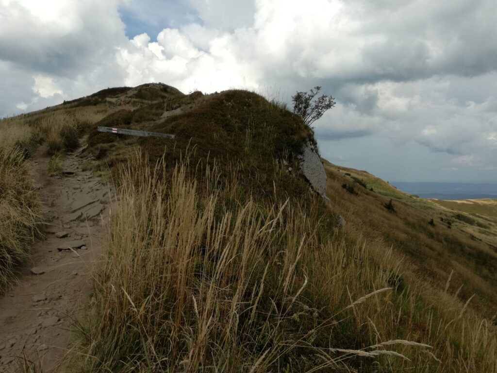 Mniej więcej od Halicza szlak pokonywaliśmy niemal biegiem. Wszystko za sprawą zbliżającej się burzy. Szlak cały czas wiedzie czerwonymi szlakówkami i dopiero na Przełęczy Goprowskiej łączy się z niebieskim. Widoczne w dole zarośla i drzewa sprawiają wrażenie jakby za chwilę miał wyskoczyć z nich niedźwiedź, a tych, jak wiadomo w Bieszczadach nie brakuje. Ten odcinek szlaku pokonuje się ścieżką zgrabnie schowaną w zboczu (na zdjęciu szlak wskazuje strzałka).