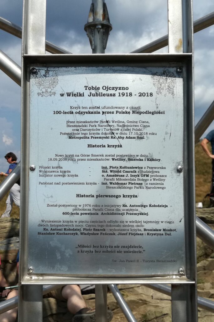 Na szczycie stoi metalowy krzyż. Tabliczka na krzyżu informuje, że obecny został ustawiony w 2018 roku, w setną rocznicę odzyskania przez Polskę niepodległości.