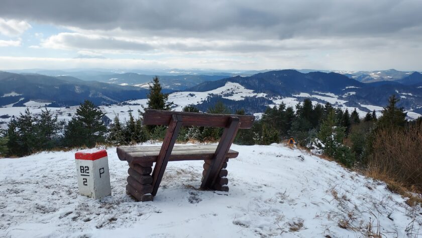 W końcu dochodzimy do Wysokiego Wierchu. Ostatnia prosta wymaga jeszcze pokonania niewielkiego fragmentu w górę, ale widoki zrekompensują wam wysiłek. Na szczycie znajduje się kilka ławek z przepięknym widokiem na Tatry, Pieniny i Beskid Sądecki. Wysoki Wierch jest kopulastym szczytem widocznym już ze szlaku. Wznosi się na wysokość 899 m n.p.m. Możecie go pominąć, jeśli idziecie dalej, na przykład na Wysoką. Zdecydowanie jednak warto na niego wejść.