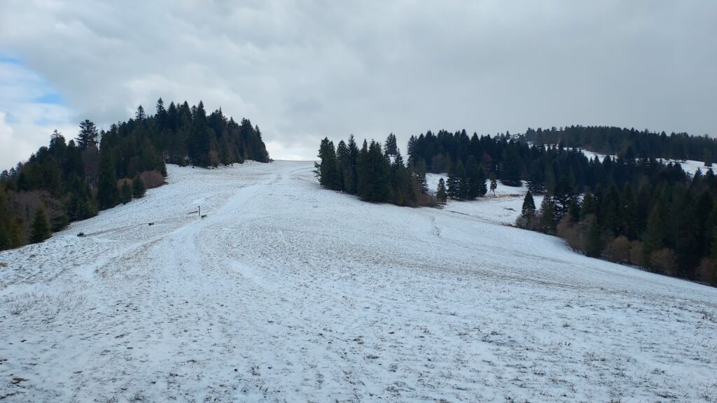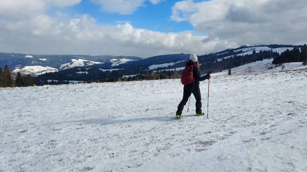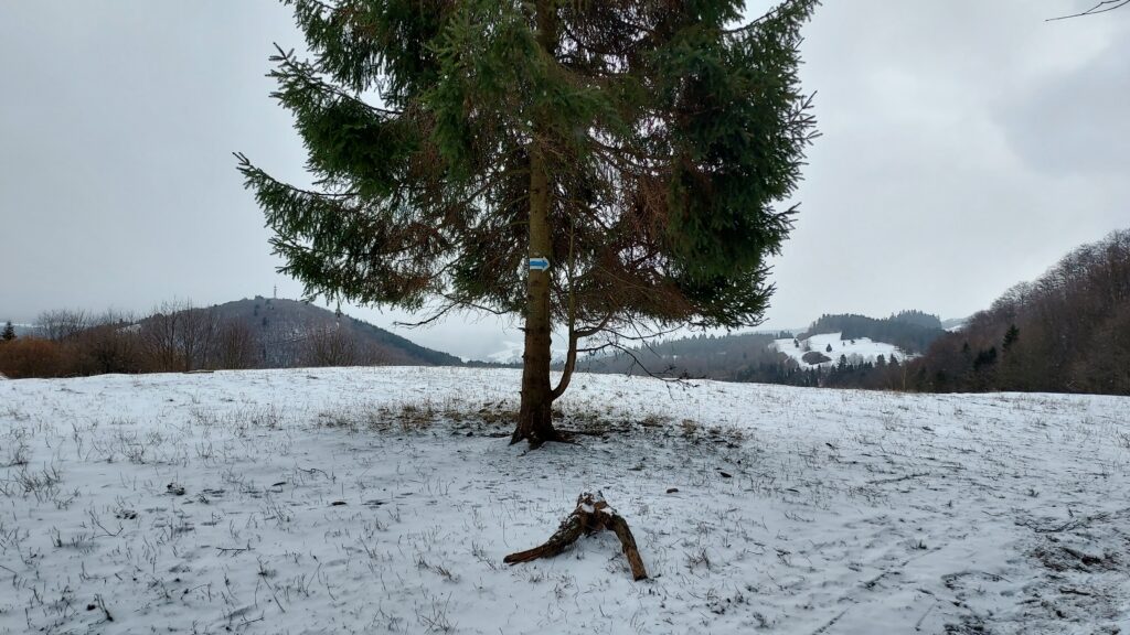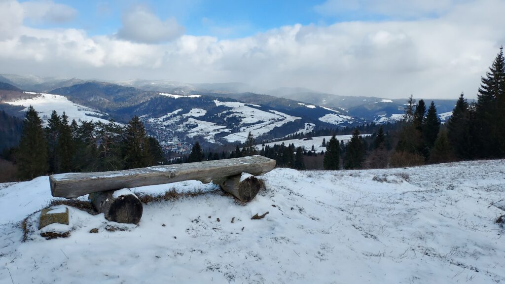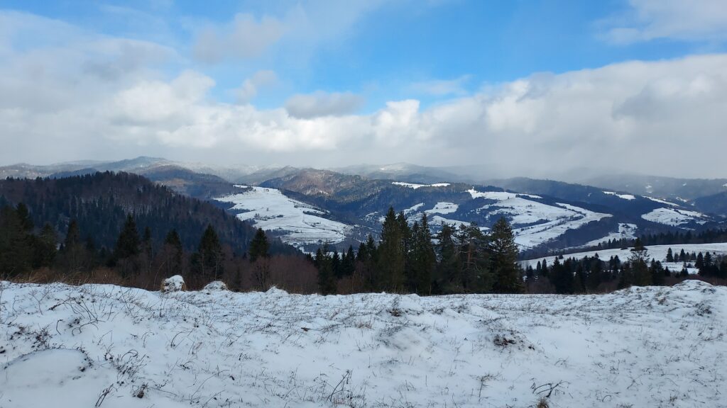 Na szczycie Szafranówki szlak zmienia kolor na niebieski. Odtąd wchodzimy w las i już w ciszy, którą tylko co jakiś czas przerywa „cześć” poruszamy się do końca niebieskim szlakiem. Poza jednym fragmentem na początku, który jest dość stromy i niektórym może sprawić minimalne trudności (paradoksalnie, ten mały fragment łatwiej było mi pokonać w zimie, w raczkach), cały szlak jest bardzo przyjemny i niezwykle widokowy.