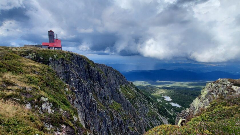W końcu dochodzimy do wspomnianego na początku domu Muminków! Nie jest to oczywiście żadna bajkowa budowla, a jedynie stacja radiowo-telewizyjna, widoczna zresztą już z samej Szklarskiej Poręby. Jest jednak bardzo charakterystyczna i okazuje się, że nie tylko mnie kojarzy się z domem Muminków! Przechodzimy obok stacji i dochodzimy do Śnieżnych Kotłów – dwóch kotłów polodowcowych – Małego i Wielkiego. Krawędź i urwisko może przyprawić o zawrót głowy, ale spokojnie – całość jest ubezpieczona łańcuchami, a punkty widokowe wyposażone są w barierki. Z punktów widokowych możemy dostrzec Góry Izerskie, Ślężę, a w dole – Śnieżne Stawki.